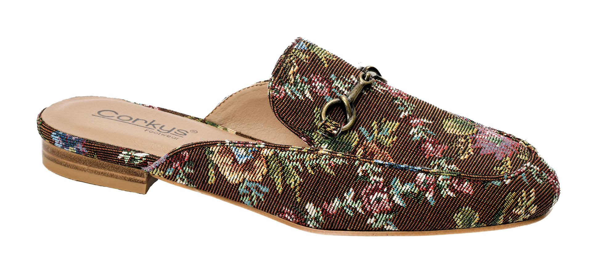 Corkys slide on brocade design Charmer mule. Slightly narrow that previous mule styles they made. Half sizes have generally sized up but when it comes to whole sizes then STAY WITH the size you or the size you NORMALLY purchase in Corkys. We have seen that if you have a narrow foot and size up then its too big across the top of the toes and if you size down then its too short, so for the narrow foot ladies we sadly suggest not ordering online. You are welcome to come by the shop and see if we have any on hand that you can try on and purchase in person. No trying to discourage buying them , just being honest and giving our best opinion. IF WE SHIP THESES the they are considered a FINAL SALE SINCE THEY ARE ON SALE !!!!!!