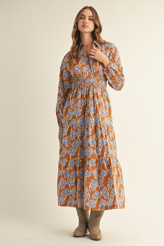 Long sleeves tiered floral midi dress, front button, collared neckline, smocked waist line. - Model is 5'9'' and is wearing a Small.