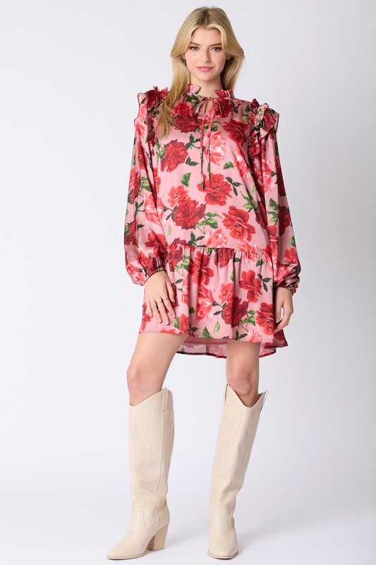 Satin Rose Printed Ruffle Detail Mini Dress –